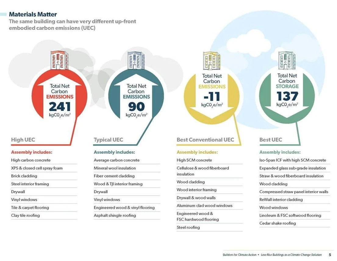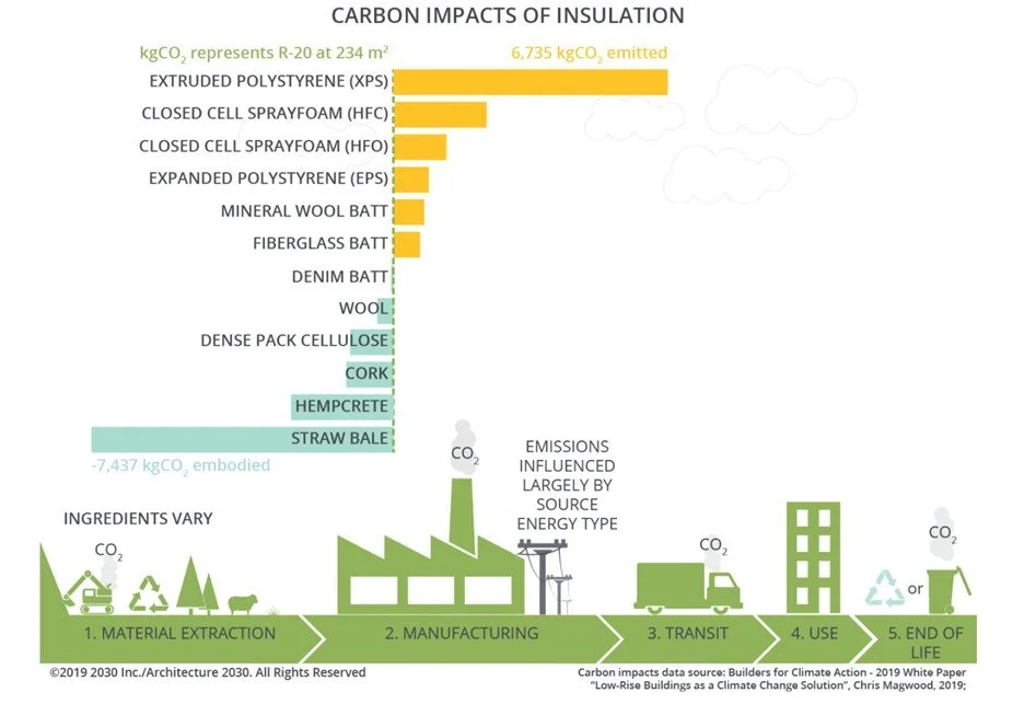 This list of seven strategies is simple to implement - these are tools you can begin to use today - and will make a dramatic difference. First, we have to understand the basics of an embodied carbon footprint. It helps to think of it in terms of currency: everything, all the “stuff” in our lives either put in or took out carbon the atmosphere. Too much carbon in the atmosphere is the problem which means too many things are putting it in rather than taking it out (storing or sequestering it). Some things that put carbon in actually “pay back” their input over time, however. Anything that puts in less than it takes out over its lifetime has a climate positive payback & if the payback period of the product is short, it is a good investment in our global health. Insulation is a primary example of this: it puts some carbon out as it is getting produced, but then it saves operational carbon over time. Some insulations do a better job at paying back than others: https://www.buildinggreen.com/news-article/avoiding-global-warming-impact-insulation.