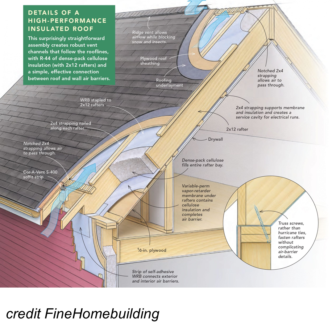 Roofs: again, cheaper is better: Whenever the design allows for a simple wood truss-roof w/ blown-in insulation and venting above the insulation, do this! And allow for a good high energy heel. Good design can work around aesthetic challenges. Embrace the energy heel and work with it! Every contractor knows & loves this system - challenges to implementation will be low.